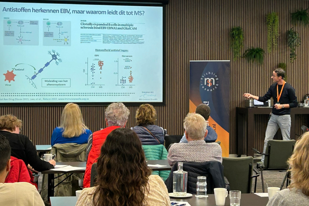 Dr. Marvin van Luijn vertelde tijdens MS Moments in Doorwerth over het Epstein-Barr-virus. Kort: EBV. Bijna iedereen raakt ooit besmet met dit virus. Maar niet iedereen die EBV heeft gehad, krijgt MS. Toch is het virus waarschijnlijk een deel van de oorzaak van MS. EBV komt terecht in de B-cellen in het afweersysteem. Hier verstoort het verschillende processen. Mogelijk veroorzaakt dit ontstekingen die ervoor kunnen zorgen dat je MS krijgt.